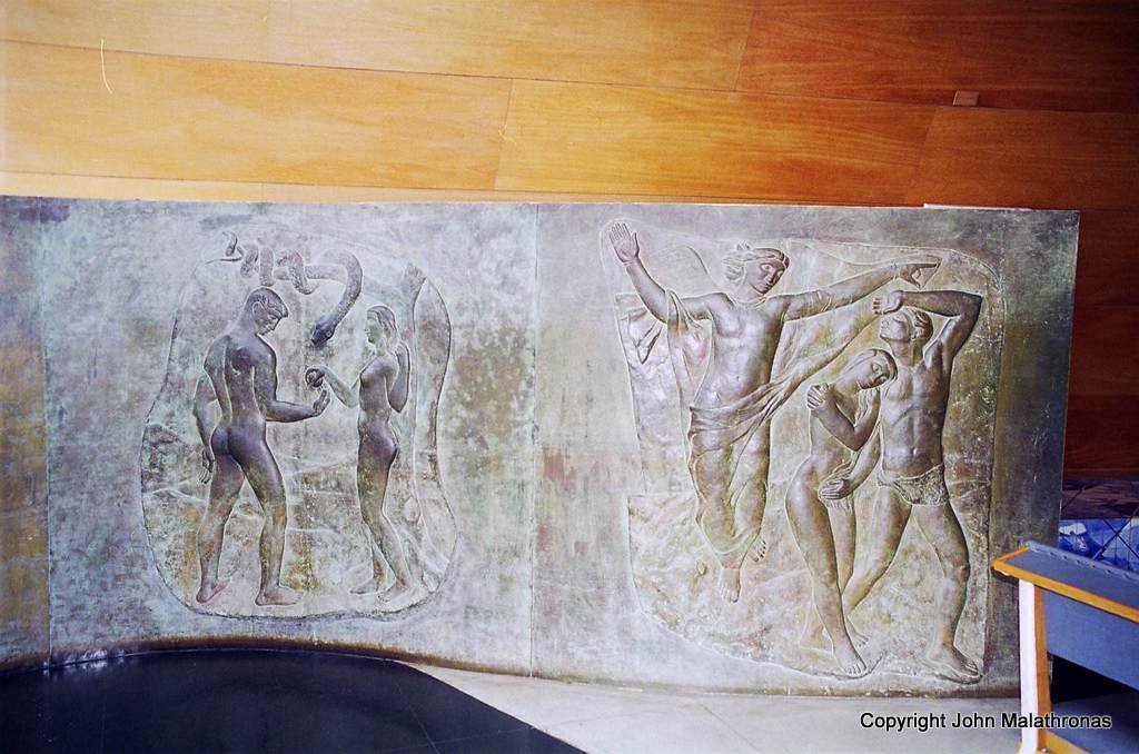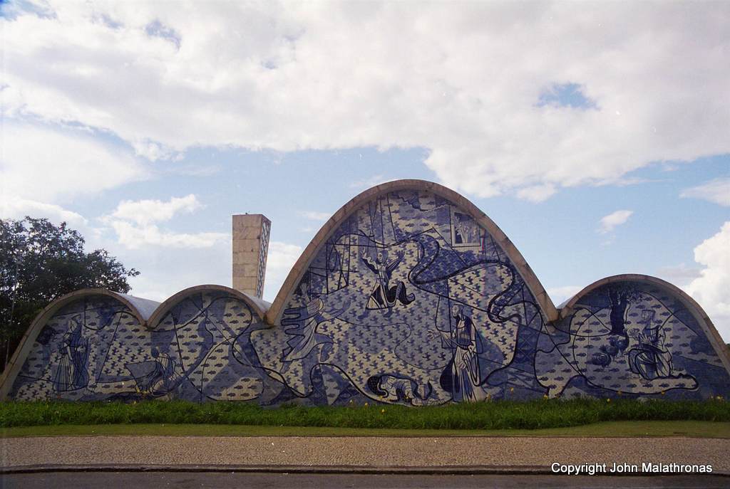 I hopped on the 2004 bus that took me straight to the city’s main monument: the audacious modernist church of São Francisco on the shores of the lake Pampulha, universally acclaimed as the best example of Niemeyer’s style. In this, he abandoned the gigantesque favouring the intimate, although he was criticised for the lack of meditative atmosphere. Blue faience tiles adorn its multiply parabolic front and the sparse space inside is composed of a discrete mosaic motif of alternating fishes and doves on a brown and blue colour arrangement. Another parabolic Picasso-inspired mural focuses the attention in the absence of an altarpiece whereas the pulpit is set on copper panels depicting the Fall, with a very naked Adam and Eve, curvy buttocks on the wrong side of decency.