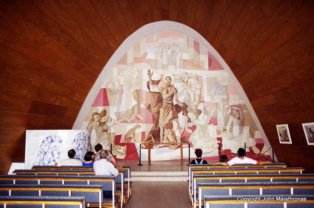 The parabolic Picasso-inspired mural inside the church. Note the controversial dog on the bottom left.