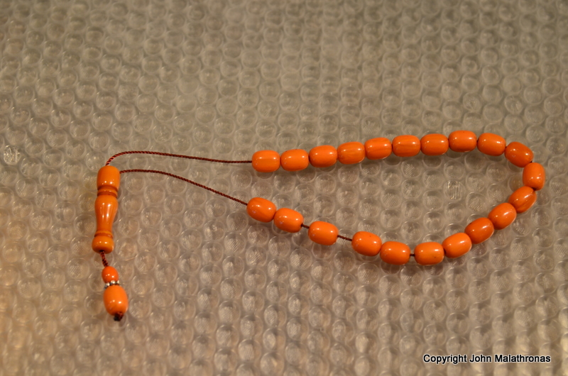 Muslim worry-beads are called Shepha (Arabic) or Desbi (Turkish) both meaning ‘prayer book‘ and are either made out of 99 beads, one for every name of Allah, or 33 for a set of prayers.It was an Arab scientist, Faturan, who invented a special method that produced beautiful, dark red amber and bakelite beads in the eighteenth century. They are rare, expensive and the methodology has been lost. Madam Rallou’s museum has a fantastic collection of such Faturan antiques. They are her pride and joy.