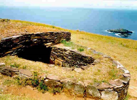 The 'chicken houses' of Orongo; the two small islands at the back were the destinations of the birdman ceremony.