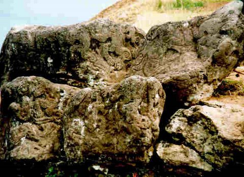 There are petroglyphs aplenty in Orongo. Note in the picture on the left, the birdman upside down (diving ?) at the top. This motif appears everywhere. Eric von Daeniken thought he was an actual being from outer space.