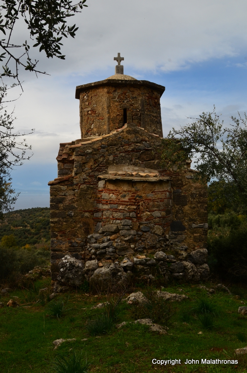 I followed Niko’s instructions. I drove on the road south until I found the turning to Xohori. Onwards for 6km, past the village of Proasteion, I eventually entered Xohori; 50m before the school I looked to my left and saw the tiny, remote church of Aghios Nicolaos. I drove around the school until the road finished. Then I walked in the direction of the church through a makeshift wooden farm gate.