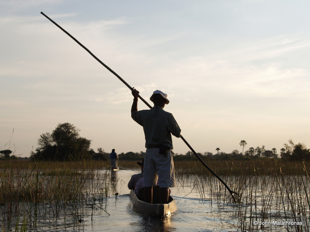 Waterbirds were especially prolific: apart from the omnipresent African jacana, there were elegant Egyptian geese, flocks of white-faced ducks, solitary foraging green-backed herons, plus gaggles of great white – and all kinds of – egrets. Open-billed storks occasionally walked among them; cormorants stood on stones drying their wings; and African darters swam immersed in the lagoons, their long thick necks protruding from the surface like watersnakes. African fish eagles perched majestically on tops of trees, while malachite kingfishers balanced on reed tops and sociable weavers’ nests – always facing west to avoid the strong eastern winds – hung sturdily over the channels.