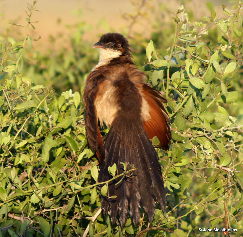 Little Vumbura was in a sense a complement to Xigera, situated as it was near dry woodland. There were no palms to be seen, while baobabs, jackalberries and bushwillows abounded, sometimes giving way to savannah scrub where knobthorn and sweet-thorn acacias were dominant. Here the sunlight played on the glossy iridescence of the plumage of Burchell’s starlings; the click-click hammer-on-the-anvil sound of the blacksmith plovers filled the air; coppery-tailed coucals spread their wings in the early morning sun to soak its rays; red-billed and yellow-billed hornbills watched us carefully from the trees; bearded woodpeckers advertised their presence in staccato outbursts; and those game birds I described earlier made Sean’s heart race.