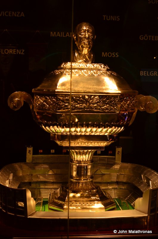 Pride of show goes to Bayern’s incredible hat-trick when they won the European Championship in three successive years 1975, ’76 and ’77. The larger cup on the left is the original, weighing 8.5kg while the other two are smaller replicas in line with UEFA policy.