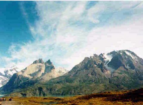Landscape inside the Torres del Paine National Park in Chilean Patagonia. Notice the people in bottom left corner to appreciate the scale.